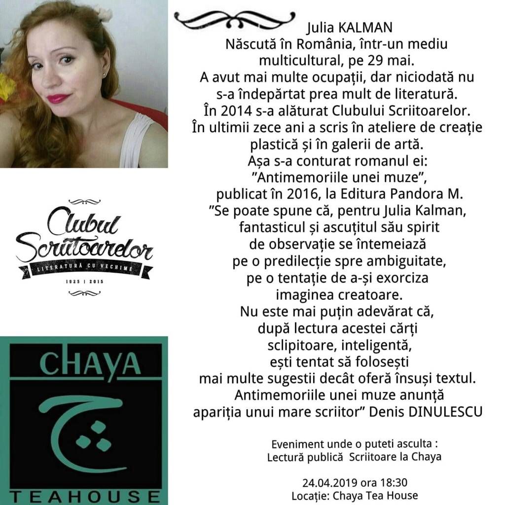 “Himeră”, Dan BotezanSpiritul expozițieiMihaela Marilena Chițac, artist plastic”Metamorfozele iubirii”, Valerie Blanche“Frumoasă pentru tine”, Ania VilalJulia Kalman, at Milu CaféLansarephoto credits: Adri